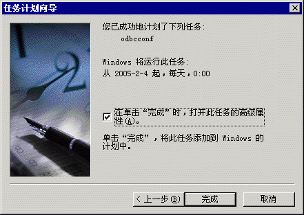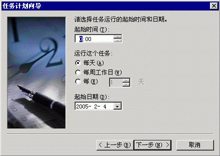 - 在新的向导窗口中选择任务的开始时间为0:00,点击“下一步”输入任务执行的用户名及密码,再次点击“下一步”,完成对话,注意一定要选择“在单击完成时,显示该任务的高级属性”。